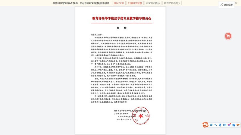 Professor Xu Xianming, Chair of the National Teaching Steering Committee for Law Programs under the Ministry of Education, sent a congratulatory letter. He highly affirmed the remarkable achievements made by BUCT’s law discipline over the past three decades in talent cultivation, discipline development, and social services, and expressed hopes that the College would take the anniversary as a new starting point to deepen discipline feature, advance teaching reforms, strengthen the cultivation of top-tier legal professionals, and contribute to the rule-of-law development of socialism with Chinese characteristics.